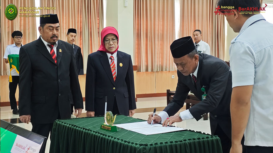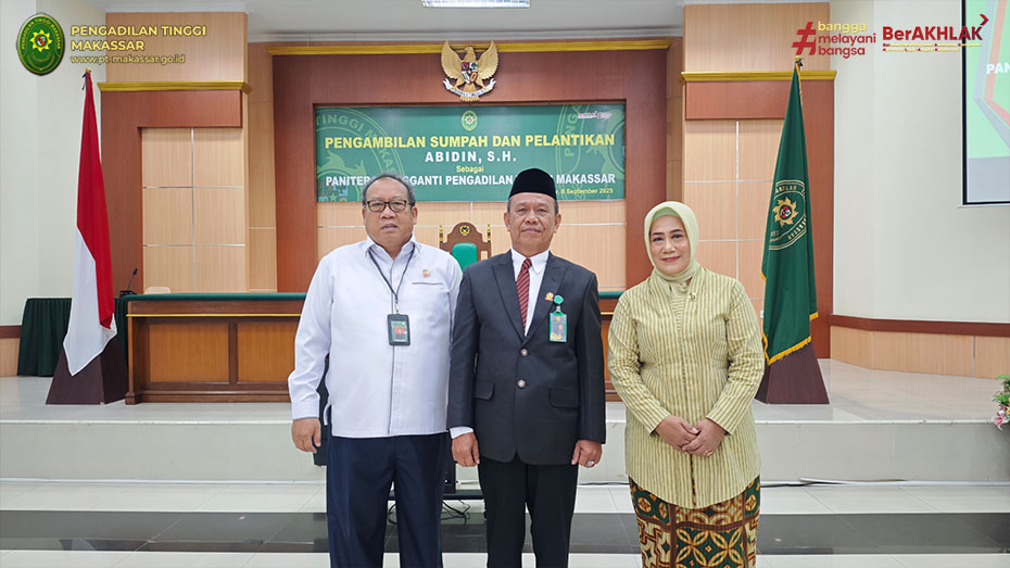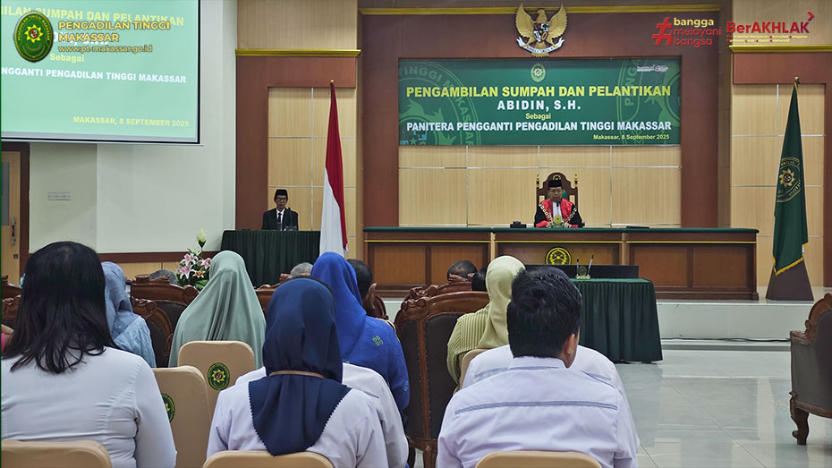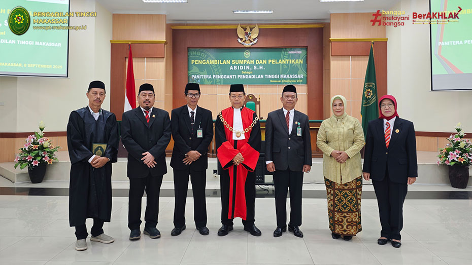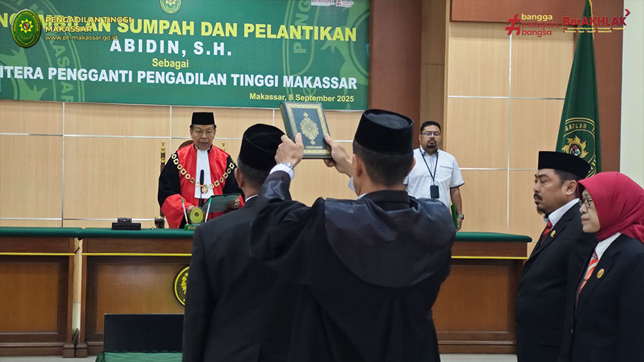 Makassar, 8 September 2025 || Bertempat di Aula Prof. Dr. H. M. Hatta Ali, S.H., M.H. Ketua Pengadilan Tinggi Makassar YM. Dr. H. Zainuddin, S.H., M.Hum. mengambil sumpah dan melantik Abidin, S.H. sebagai Panitera Pengganti pada Pengadilan Tinggi Makassar.